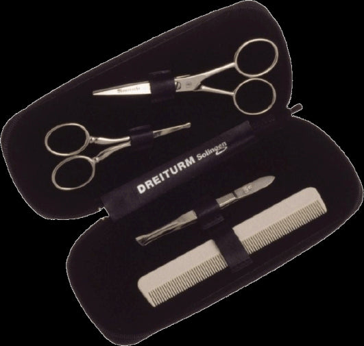 Premium set includes a nasal scissor w/rounded safety tips, moustache/beard scissor, slant tweezers, and off white moustache comb. Leather case zips to close. Made in Germany.