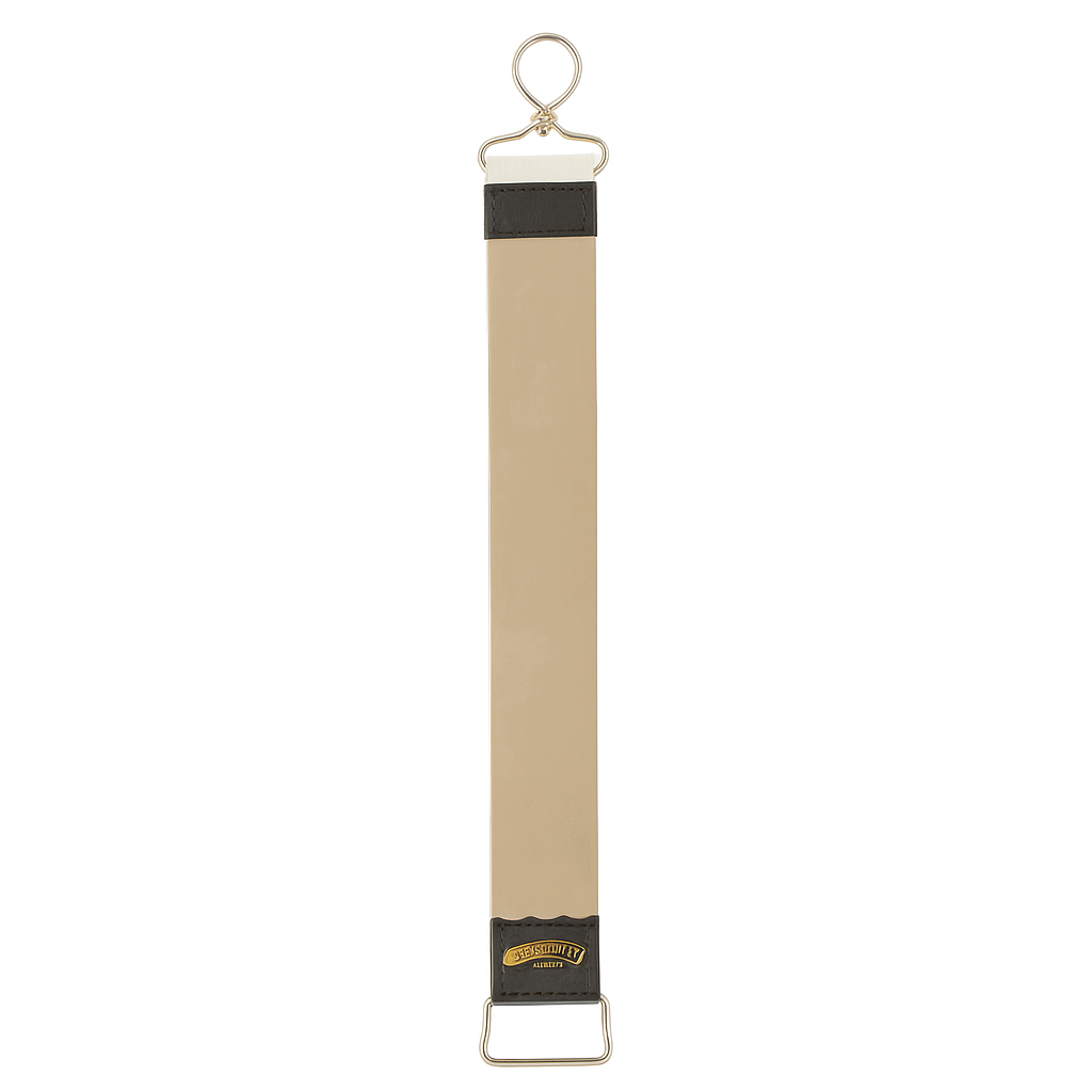 This is a "must have" for all straight razor shavers. A strop helps maintain a fine cutting edge on a straight razor and should be used regularly. The Strop combines premium quality leather on one side with canvas on the reverse. The canvas side produces the same effect as a light honing and extends the period between honings. Swivel ring at top of strop, hand ring at the bottom.
