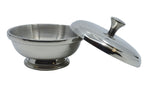 Treat yourself like royalty with this English pewter shave bowl. This compact mirror finished bowl sits on a pedestal which makes it easy to grip in the palm of your hand. The matching mirror finished handled lid keeps the shave soap out of sight when not in use. The interior of the bowl and lid have a satin finish. Col. Conk 2oz. shave soap included (scents will vary). Boxed.
